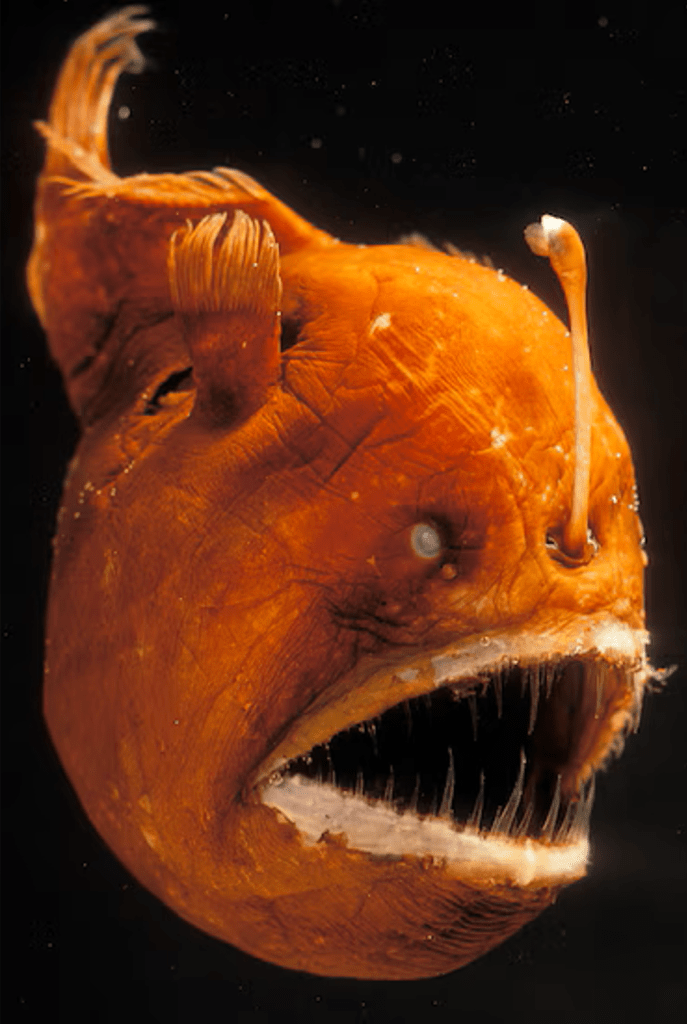 When looking at the reference images, I noticed that the angler fish had a distinctive tapered body and tail in the back, and in some images a very distinctive protrusion to the lower jaw.