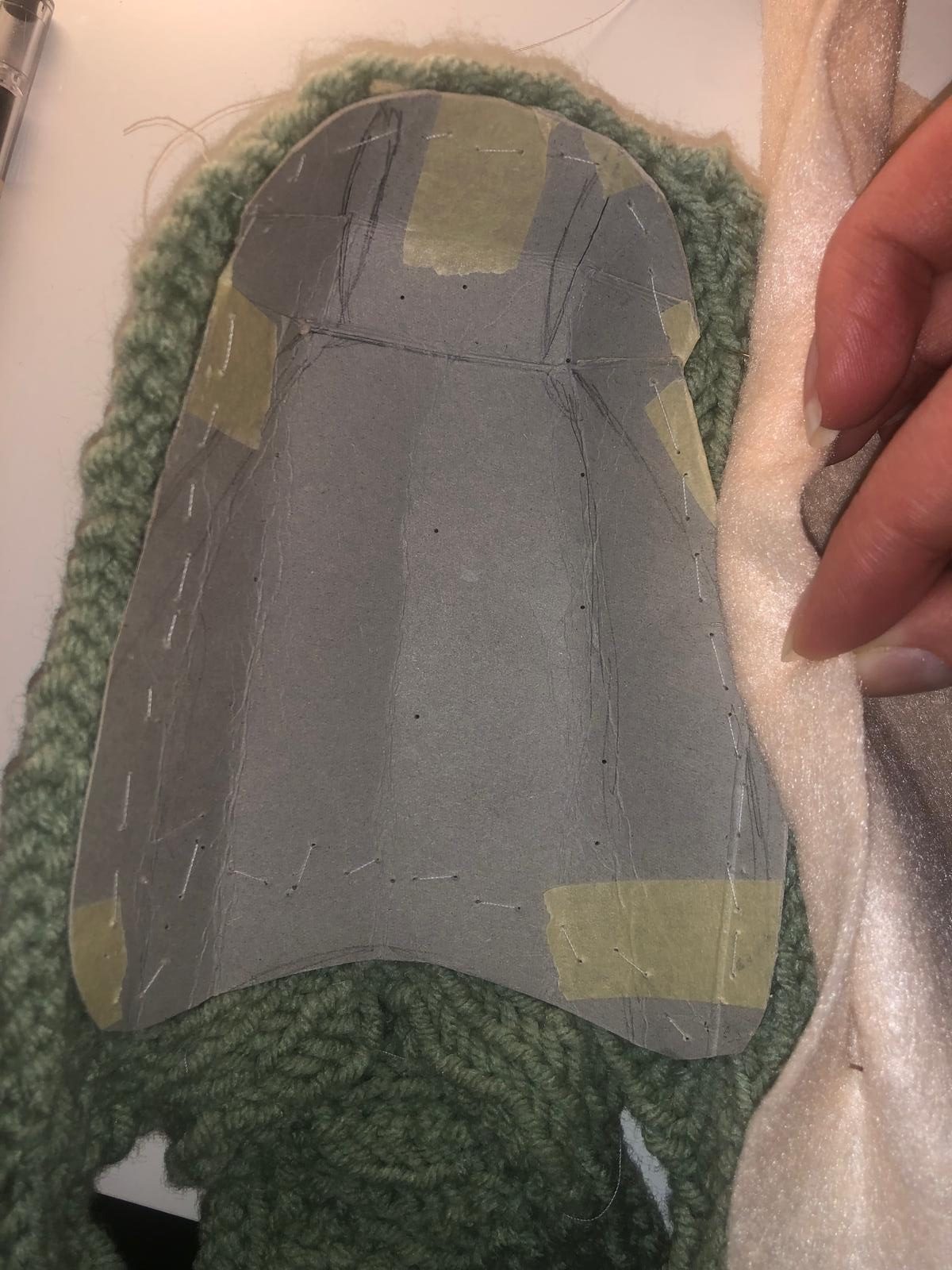 Another thing I had learned while making the prototypes was that the band I had been putting in often contorted in a way that made it too small to fit on the head of the cat, so I removed this from the design in this iteration, by sewing one end under the cardboard section of the cap. (See the pins in the image above)