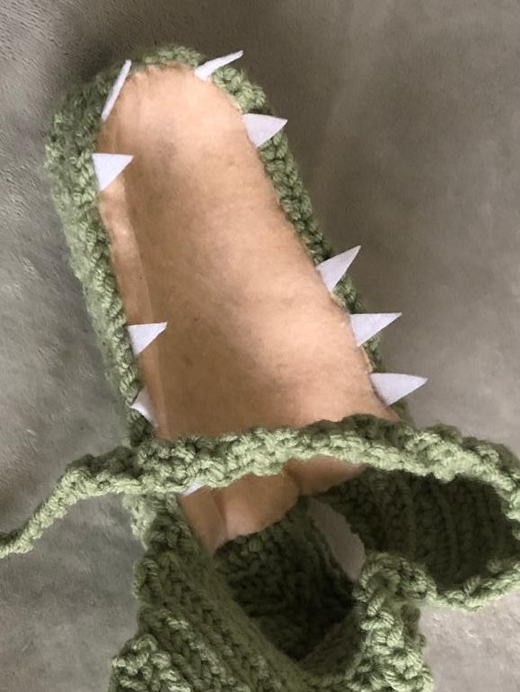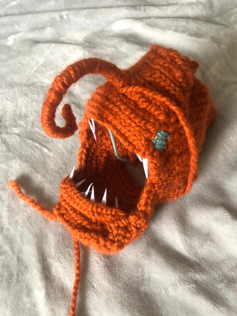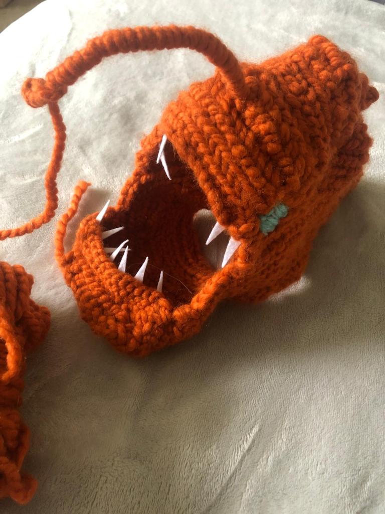 To create the distinctive shape in the back I started making the structure by creating essentially a flat donut that I then folded like a taco. One side of this taco was able to be pinched with a single stitch to create the back fin and then the stitch was later increased to create the body, but before this I set the size of the mouth to guide the size of everything else.