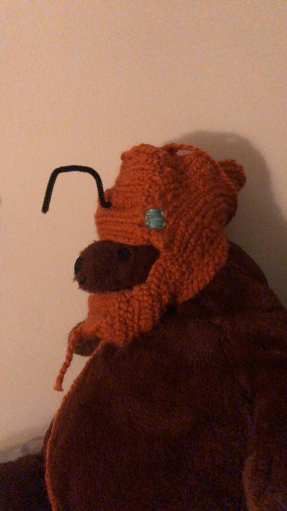 Then I worked on the iconic antenna at the top of the head. I thought about trying to do it entirely out of crochet, however because I was working with really thick yarn and needed the antenna to be relatively thin, I decided to take a lesson from my previous project and create a reinforcement piece out of a pipe cleaner.