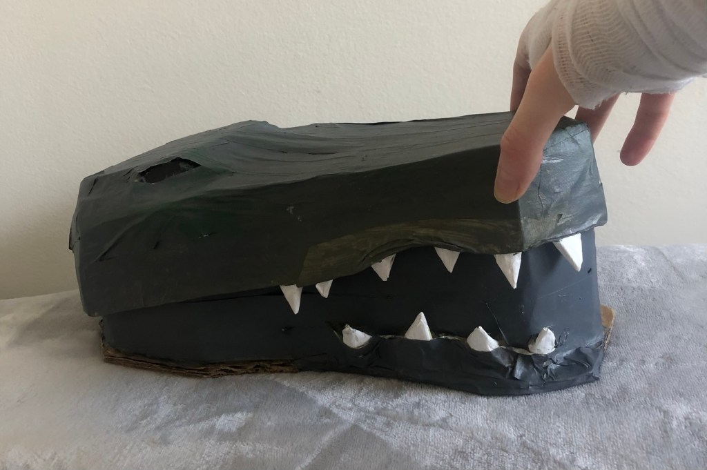 Creating specialized packaging for crocheted crocodile cat-hat.
