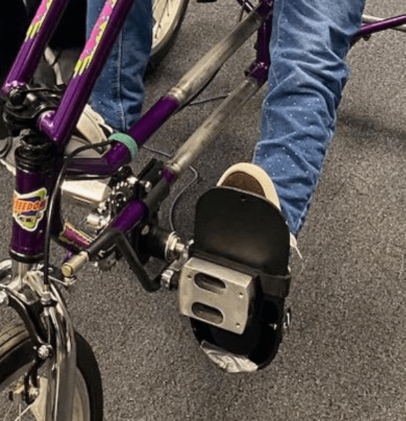 To help with the splaying in the legs we decided that we would create a brace that would allow for the leg to be kept in the correct posture for physical therapy. To test this concept, I created a low fidelity prototype using a wooden dowel and a Velcro strap. This was screwed into the existing pedal and was used as a proof of concept when meeting with Mya, her family and Physical Therapist.